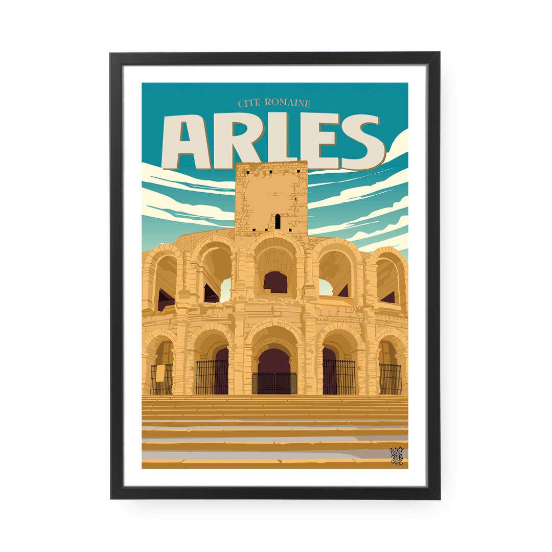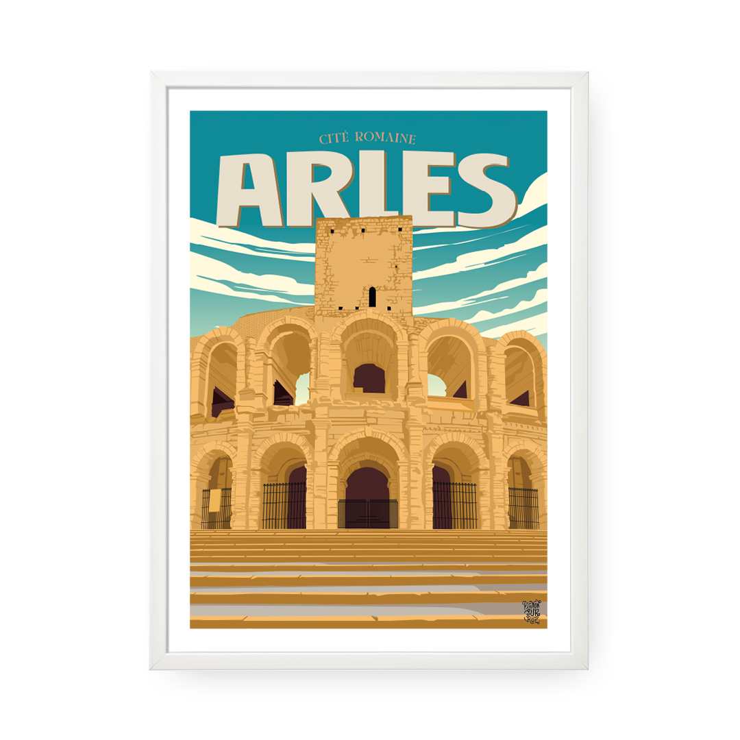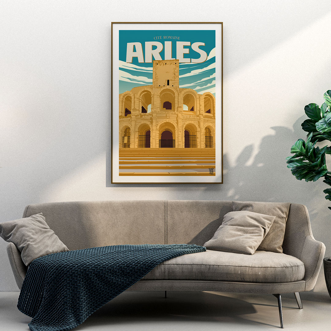 🎭 Ville romaine et camarguaise, Arles est un carrefour d’histoire et de lumière. Cette affiche vintage d’Arles mêle arènes antiques, pierres dorées et mémoire de Van Gogh, qui y peignit plus de 300 toiles.