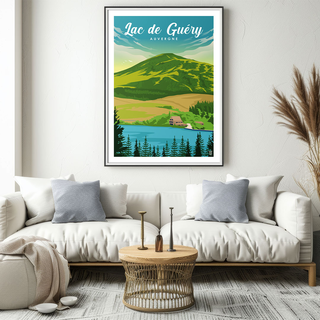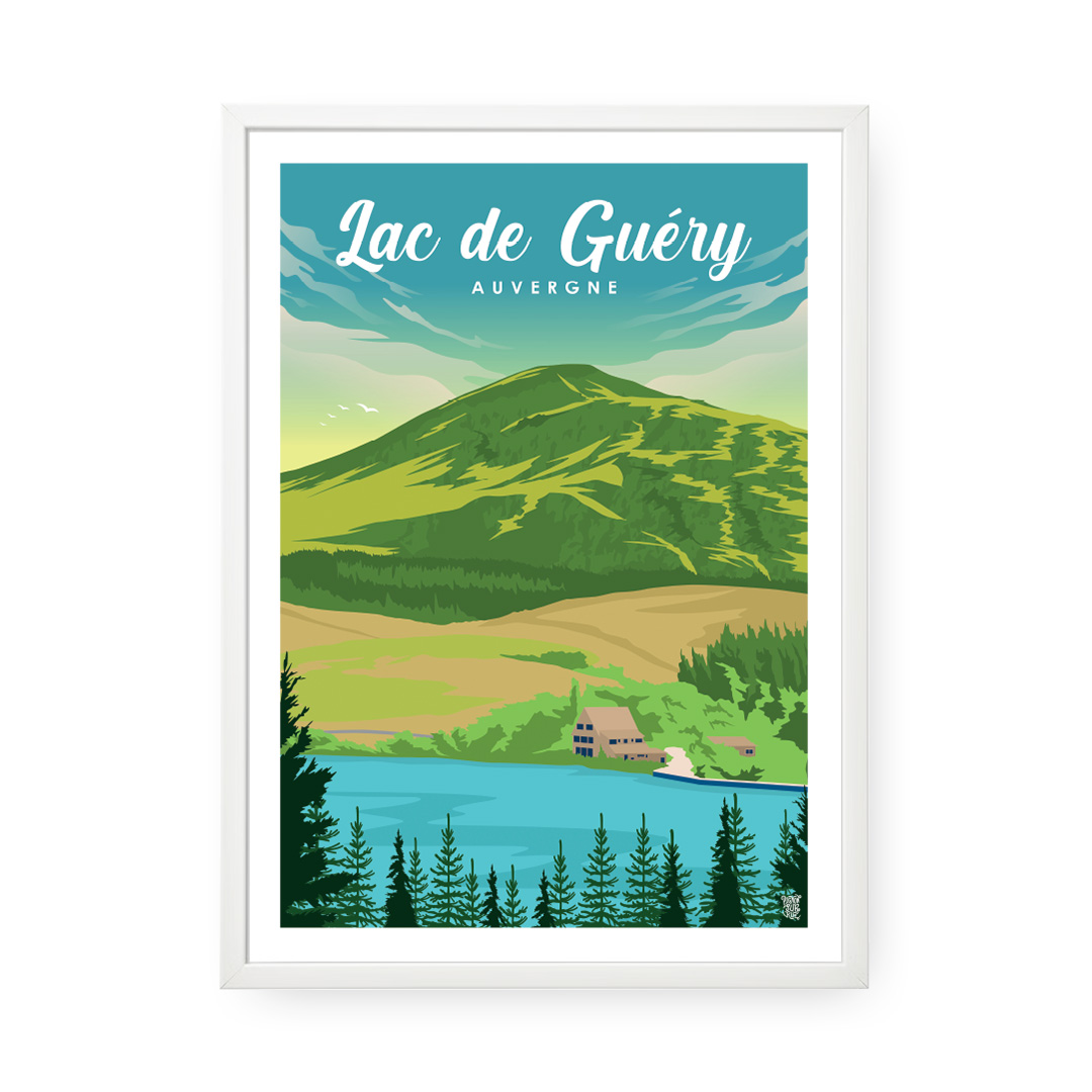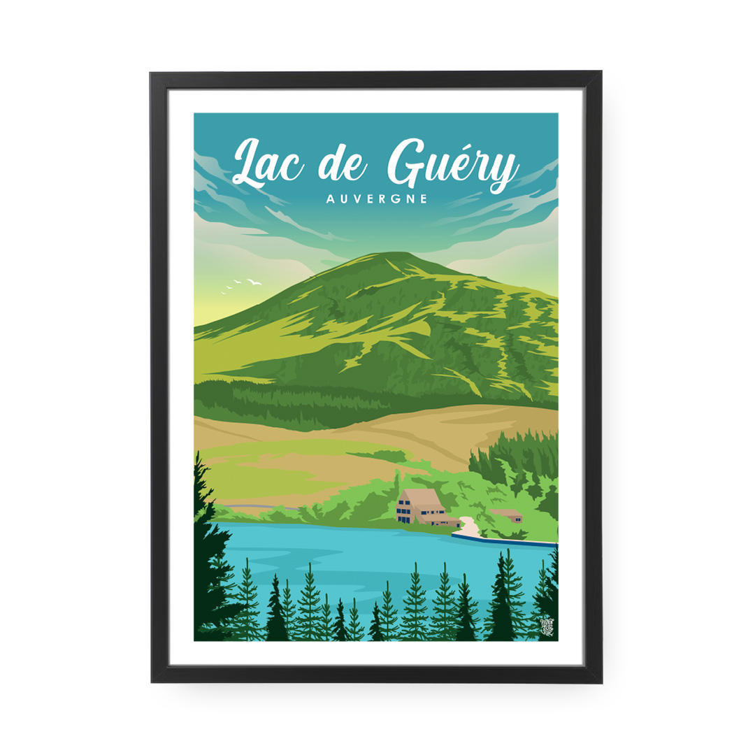 🎣 Haut perché à 1 244 m, le lac de Guéry est le plus haut lac d’Auvergne. Ce poster du lac de Guéry illustre ses eaux sombres, le silence qui l’entoure et les deux roches Tuilière et Sanadoire en arrière-plan.