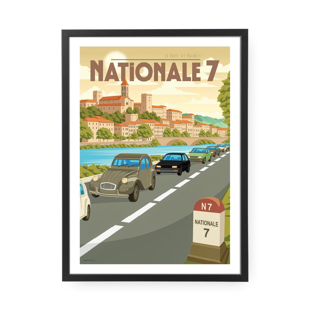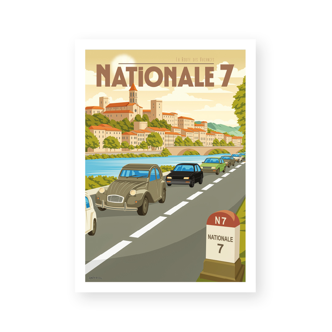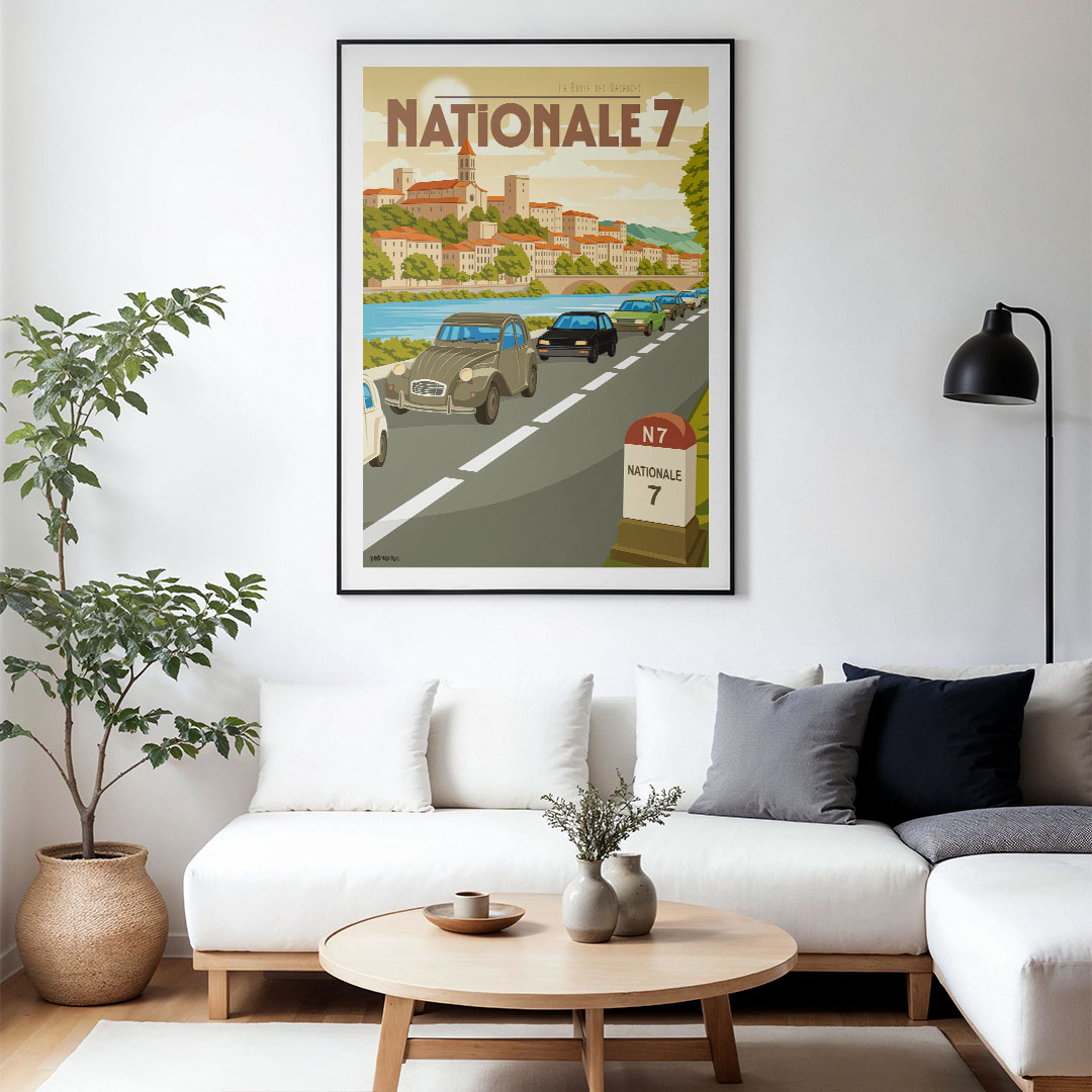 🚗 Mythe roulant, la Route Nationale 7 relie Paris à la Côte d’Azur en traversant la France des vacances, des stations-service vintage et des villages endormis. Ce poster de la RN7 évoque les vieilles 4L, les glaces sur le bord de la route et les slows qui tournent dans l’autoradio.