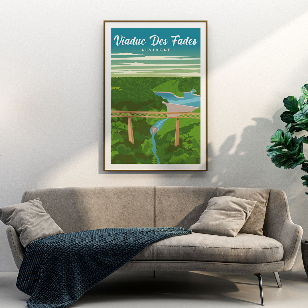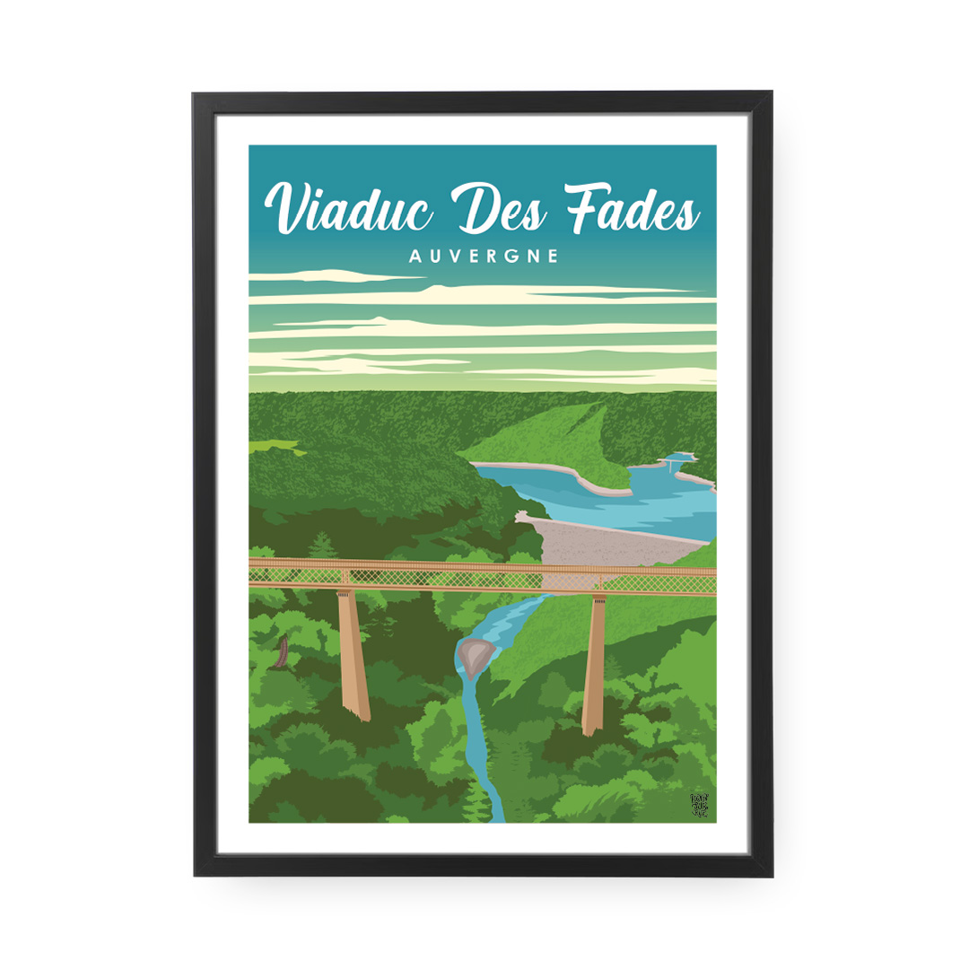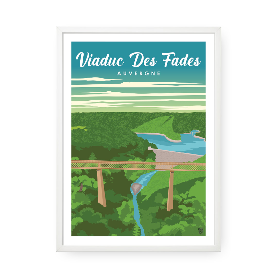 🌲 Cette affiche du viaduc des Fades le présente immergé dans la forêt, partiellement recouvert par la végétation, comme une ruine industrielle majestueuse.